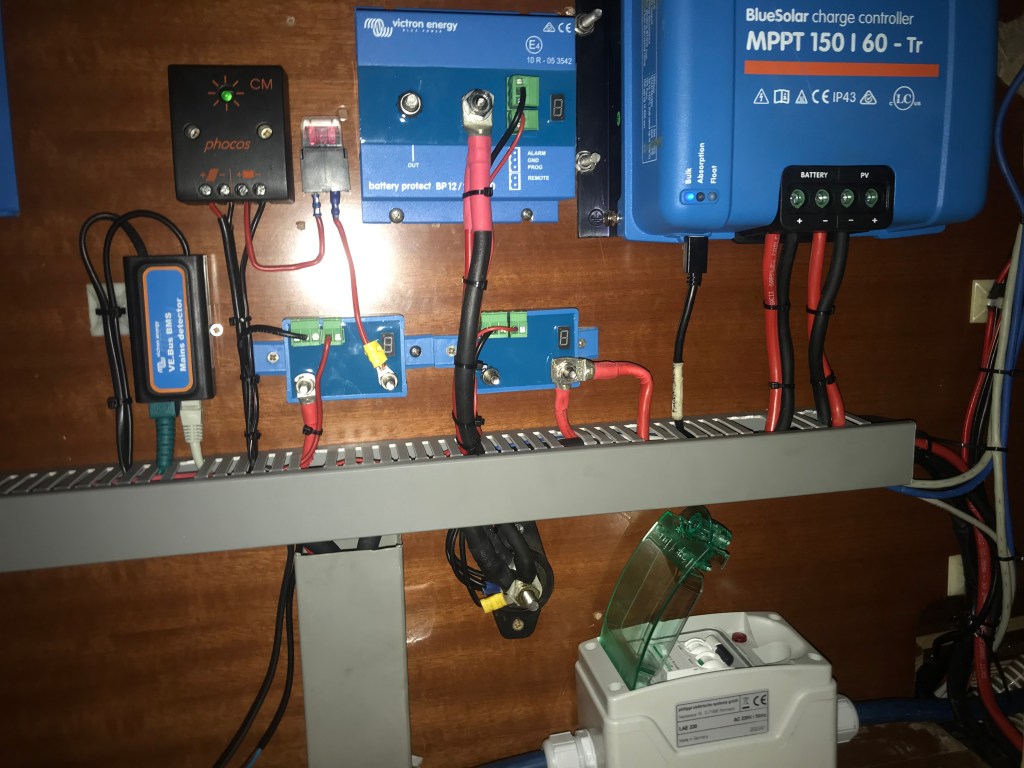 - A completely new electrical installation including 600 Ah of lithium batteries, a new AGM starter battery, 3000 W inverter/charger, 600 W of solar panels on the stainless steel arch and all the stuff needed to protect, control and monitor this equipment.